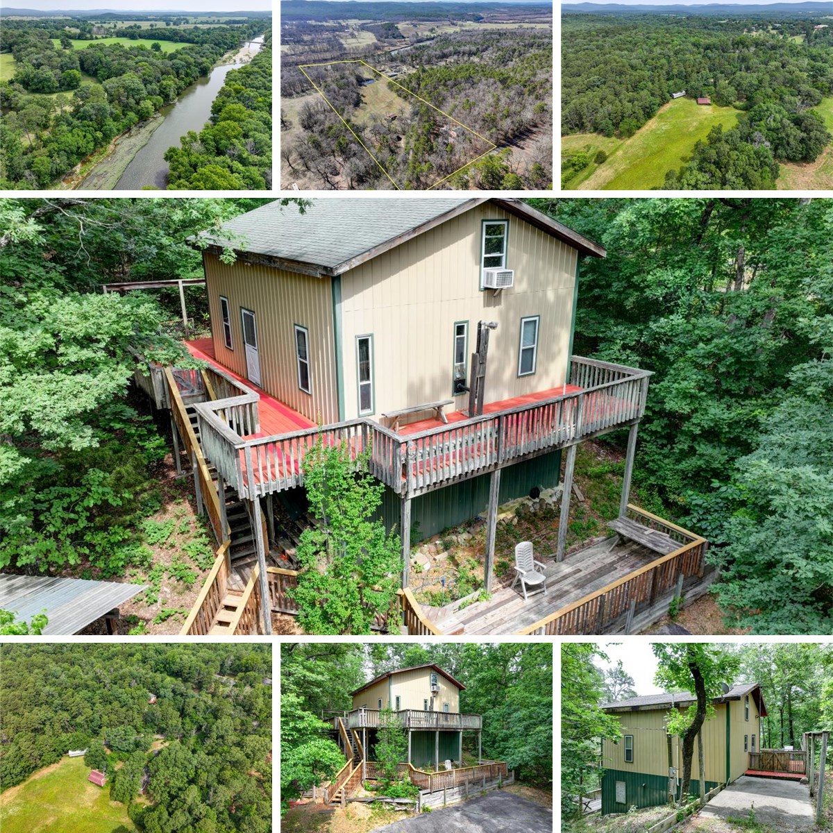 The main home (built in 2004) offers approximately 1,128 sq ft with a durable metal exterior, 3 bedrooms, and 1.5 baths. A spacious deck provides scenic views of the surrounding landscape, while the elevated structure allows space underneath for storage or storm shelter. The home is accessible from both Black Cherry Lane and River Drive, adding convenience and flexibility.